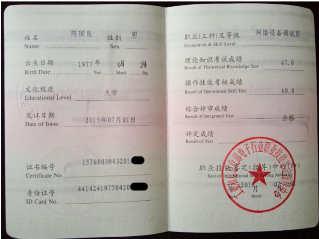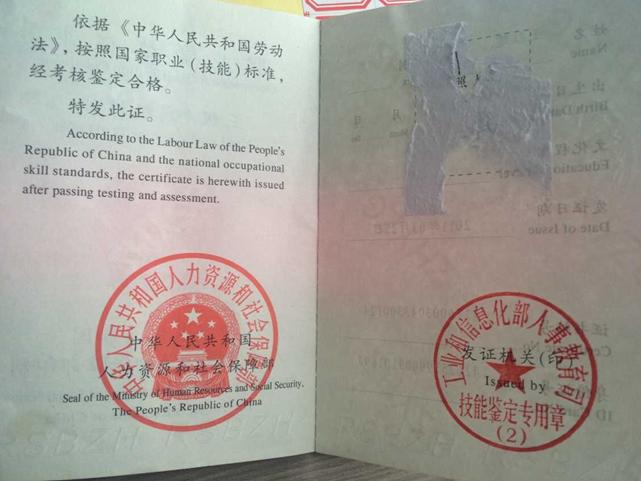 电子行业特有工种职业技能鉴定证书由劳动和社会保障部统一印制,同时加盖信息产业部人事司印章、信息产业部电子行业技能鉴定专用钢印。