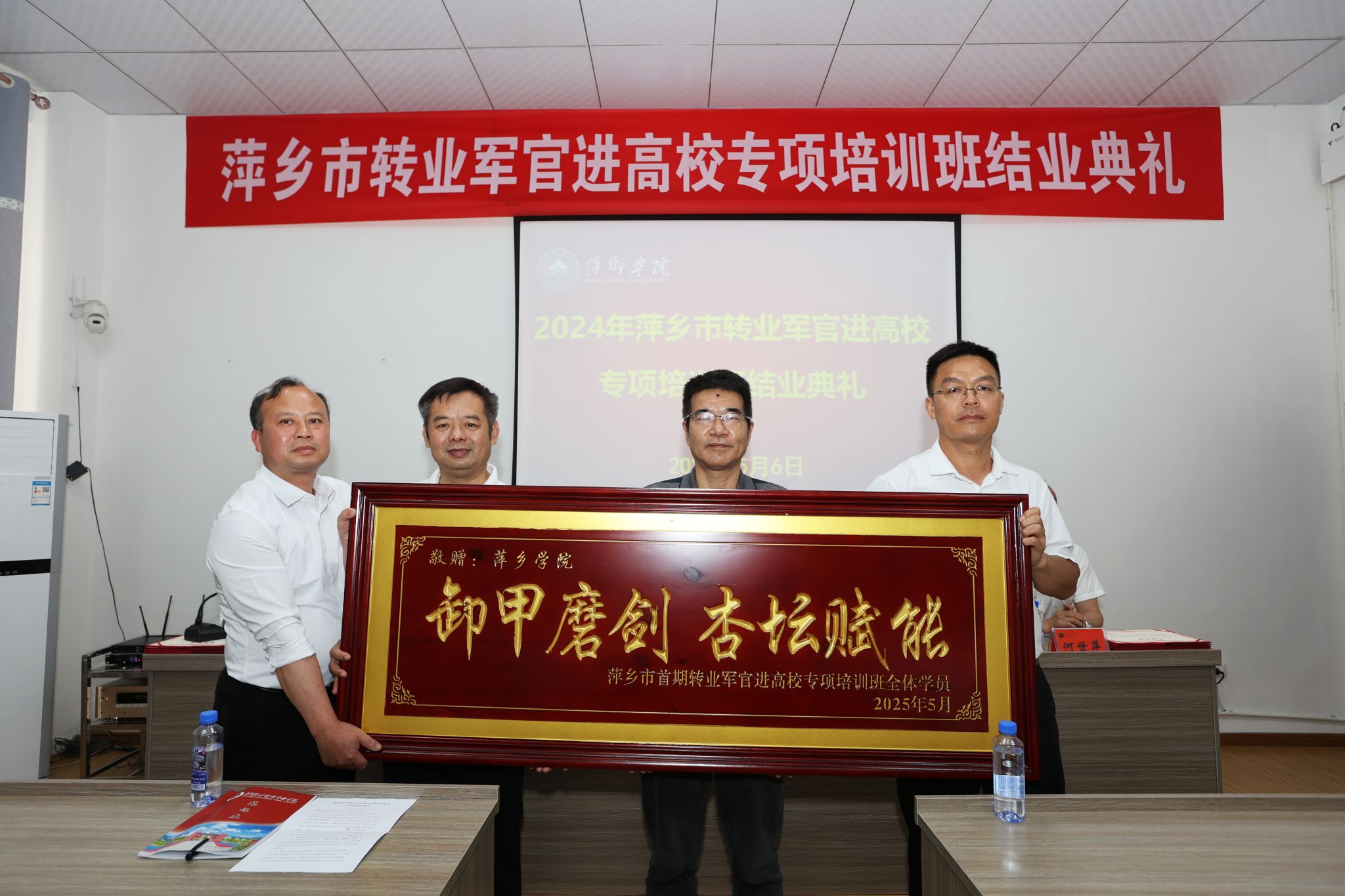 2025年5月6日上午,2024年萍乡市转业军官进高校专项培训班结业典礼在萍乡学院鼎新楼继续教育学院培训室举行,校党委委员、副校长黄志开,萍乡市退役军人事务局党组书记、局长龙军,萍乡市退役军人事务局党组成员、副局长何世萍,继续教育学院党总支书记肖国正出席,继续教育学院院长黄红华主持。